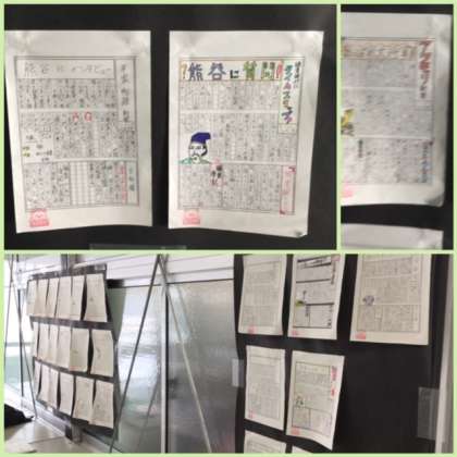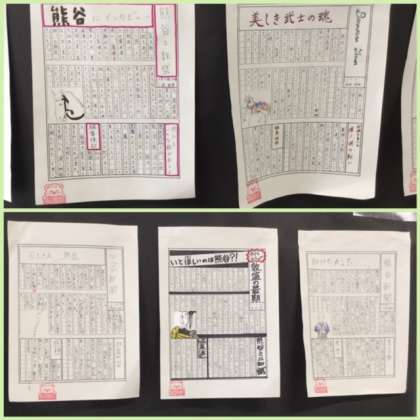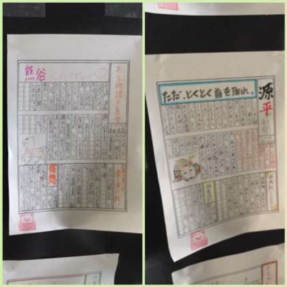 2年生の教室前には、先日学習をした「平家物語」にちなんで、各生徒が作った新聞が掲示されています。見出しや記事に工夫がされています。