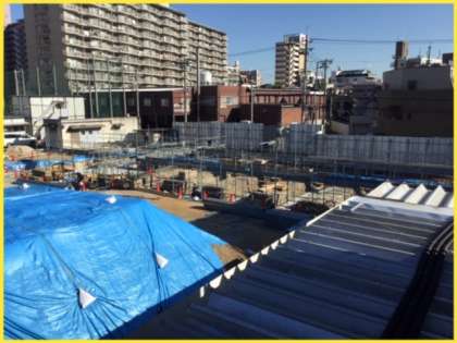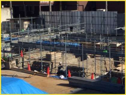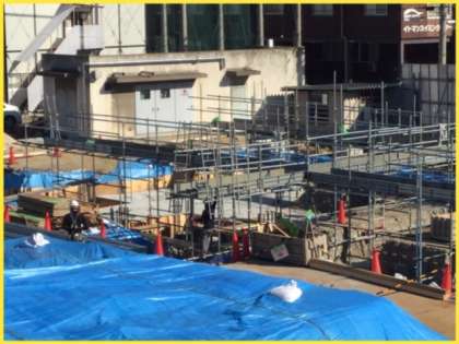 15日(金)、朝の工事の様子です。足場が立てられています。