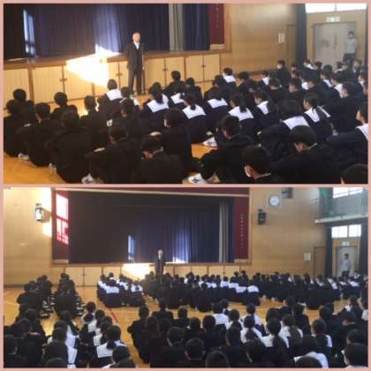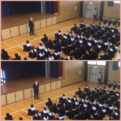 18日(月)、体育館で全校朝礼がありました。校長先生から、先週違法薬物のニュースがあり、絶対に手を出してはだめだというお話がありました。しかし、今週も、ある女優が違法薬物をもっていたというニュースが出てきて、薬物乱用が拡大していることなどのお話がありました。さらに、校長先生からは、天皇即位のお祝いのパレードの様子から、平成のパレードとの違いをお話されました。令和のパレードで、スマホによる撮影のため、沿道の人たちはみんな手を挙げて、撮影していましたが、平成のパレードの時にはなかった光景です。そのスマホの使い方を誤れば、大きな失敗となり、人を傷つけ、苦しめることになるというお話を、8月高速道路であおり運転をしていた容疑者と人まちがいをして、別の女性をSNSにあげたことを例としてお話されました。
