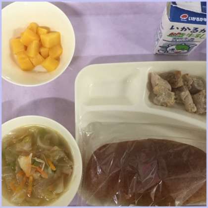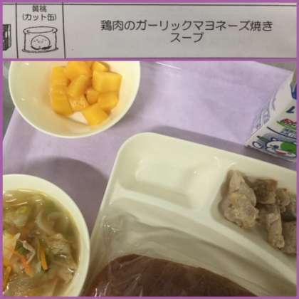本日の献立は、鶏肉のガ−リックマヨネーズ焼き、スープ、桜桃です。