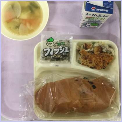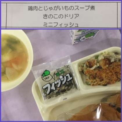 本日の献立は、鶏肉とじゃがいものスープ煮、きのこのドリア、ミニフィッシュです。