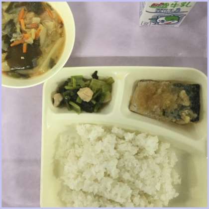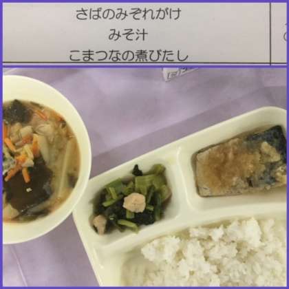 本日の献立は、さばのみぞれがけ、みそ汁、こまつなの煮びたしです。