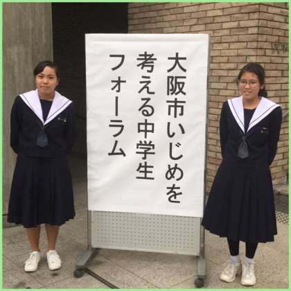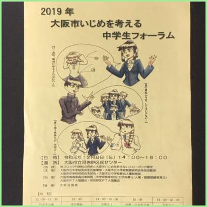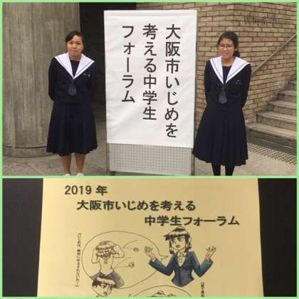8日(日)、阿倍野区民センターで、「大阪市いじめを考える子どもフォーラム」が開催されました。本校から、生徒会役員の二人が参加してくれました。当日ホール内での撮影が禁止されましたので、区民センター入り口で写真を撮りました。このフォーラムは、大阪市の各中学校で、いじめについて考え、どうすれば大阪からいじめがなくなるのかを考え、それを発表しあったものです。2019年の大阪市全体のスローガンは、「いじめストップ 見のがし0(ゼロ)」になりました。今後、本校でも生徒会のみなさんが、これをもとに活動してくれることを期待します。