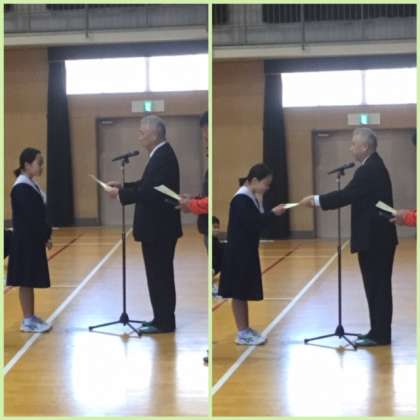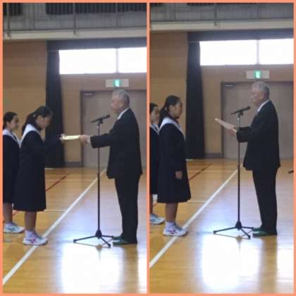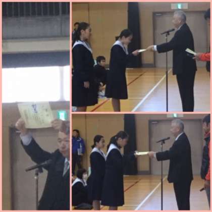 書道部の人たちの「特選」の賞状伝達がありました。賞状に、作品が印刷されている珍しい賞状です。