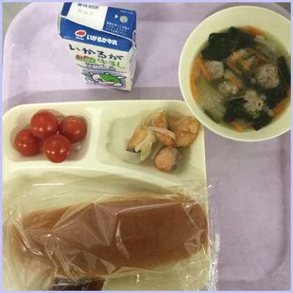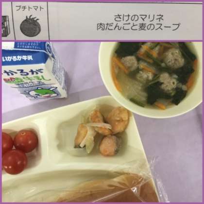 本日の献立は、さけのマリネ、肉だんごと麦のスープ、プチトマトです。