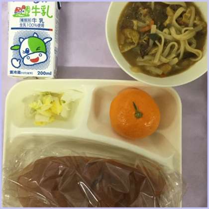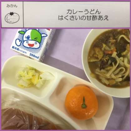 本日の献立は、カレーうどん、はくさいの甘酢あえ、みかんです。