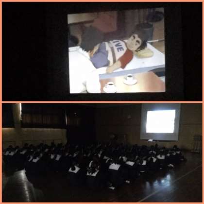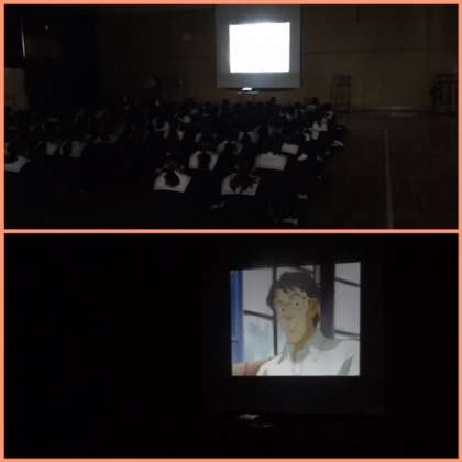人権学習の一環として、1年生は、格技室でDVD「風の旅人」を鑑賞し、障がいのある人への理解のために学習しました。
