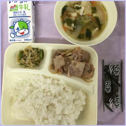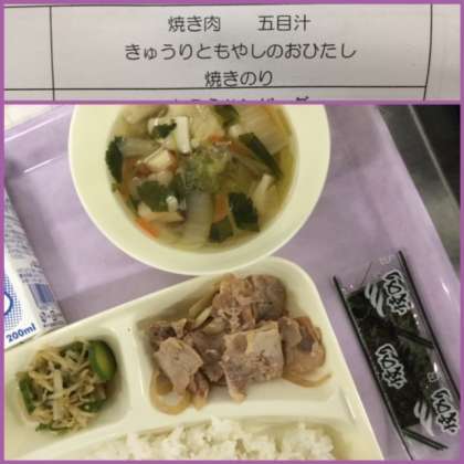 本日の献立は、焼き肉、五目汁、きゅうりともやしのおひたし、焼きのりです。