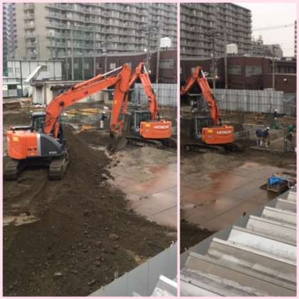 18日(水)、朝からの雨。北館校舎の建て替え工事は雨の中でも工事が進められています。