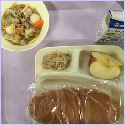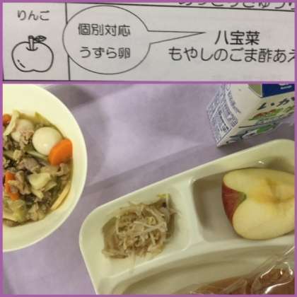 本日の献立は、八宝菜、もやしのごま酢あえ、りんごです。
