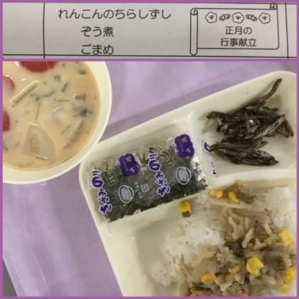 本日の献立は、お正月の行事献立として、れんこんのちらしずし、雑煮、ごまめです。