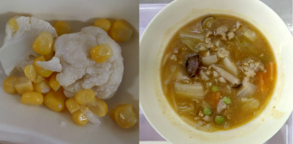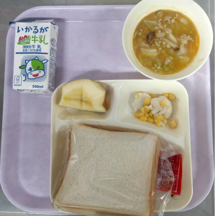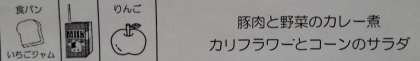 本日の学校給食は、豚肉と野菜のカレー煮、カリフラワーとコーンのサラダ、リンゴ、食パン、牛乳、いちごジャムです。