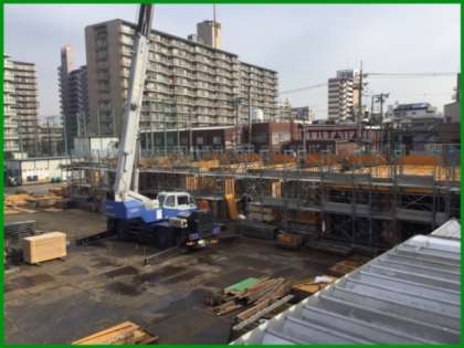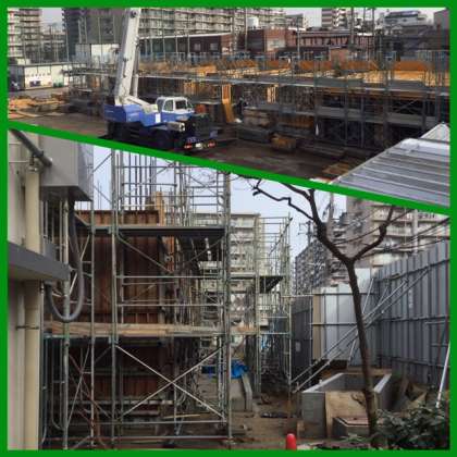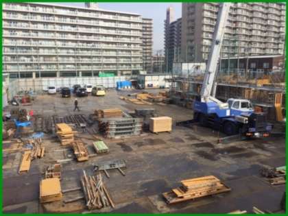 鉄筋をくみ上げ、コンクリートの型枠が建てられています。