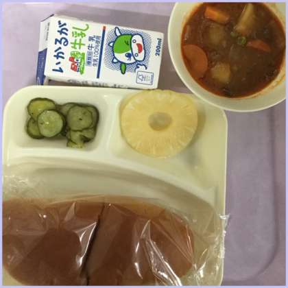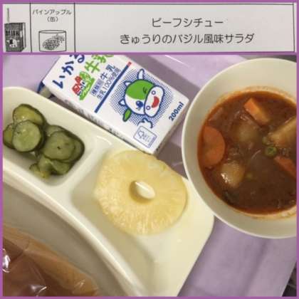 本日の献立は、ビーフシチュー、きゅうりのバジル風味サラダ、パインアップル(缶)です。