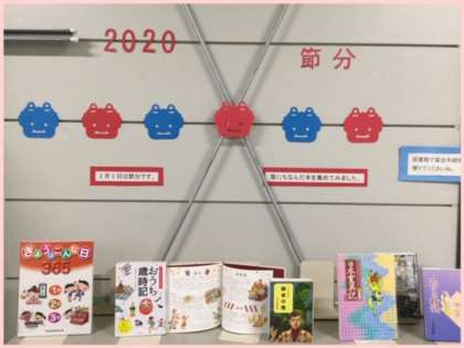大寒が過ぎたのですが、今年は本当に暖かい冬です。2月4日は、立春で暦の上では、春を迎えます。その前日、2月3日は、節分。図書室の入り口は、節分にちなんだ本の紹介が始まりました。春を迎えて、どんな本を読みますか