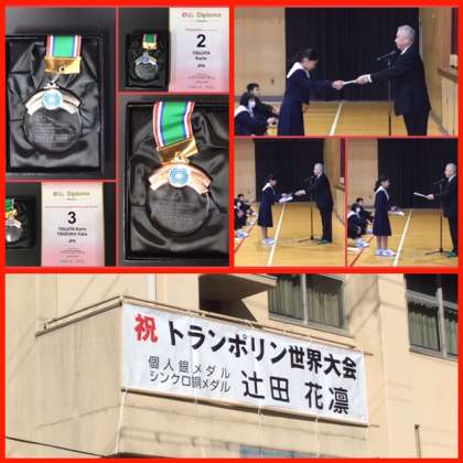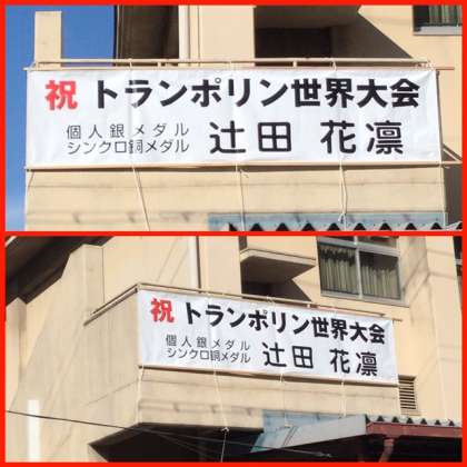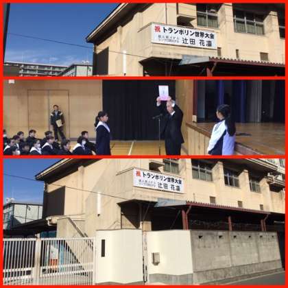 昨年12月に、本校1年生の辻田さんが、「第27回世界年齢別トランポリン競技大会」で銀メダル、銅メダルを獲得したのを記念して、PTAから横断幕が贈られました。正門上に掲げてあります。