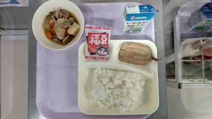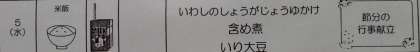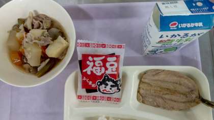 本日は節分の行事献立です。いわしのしょうがじょうゆかけ、含め煮、いり大豆、米飯、牛乳でした。