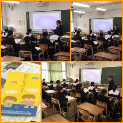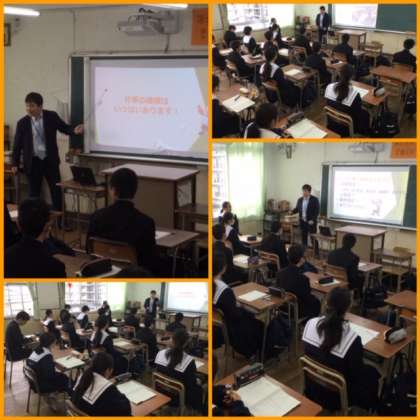 公務員のお仕事について、大阪府庁からお越しいただき、主に、獣医師の仕事など珍しいお仕事の話がありました。そして、幼稚園の先生として、東粉浜幼稚園の先生にお越しいただき、お話を伺いました。また、介護士のお話としてsy会福祉協議会「さざなみ」からお越しいただき、福祉について勉強をしました。