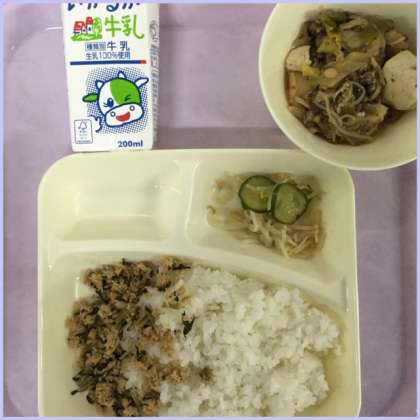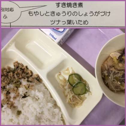 本日の献立は、すき焼き煮、もやしときゅうりのしょうがづけ、ツナっ葉いためです。