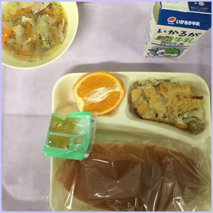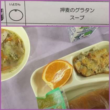 本日の献立は、押麦のグラタン、スープ、いよかん、リンゴジャムです。