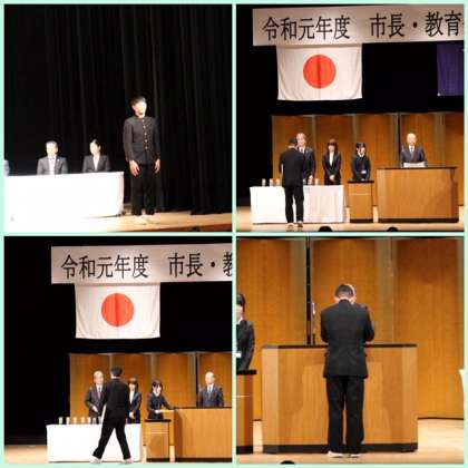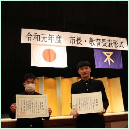 15日、東成区民センターで、令和元年度市長、教育長表彰式がありました。その表彰式で、本校ハンドボール部3年生の高橋君と吉川君が表彰されました。