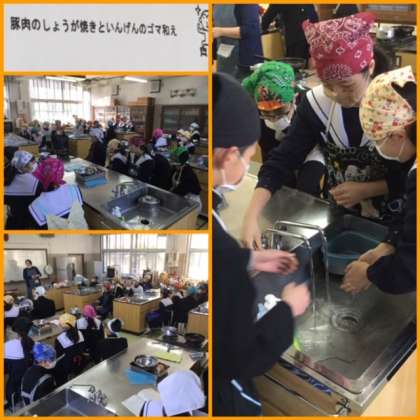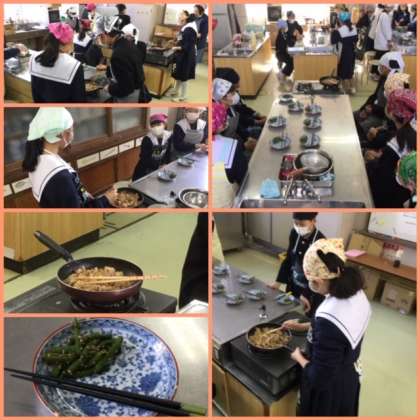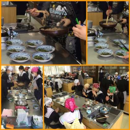 2,3限を使って、1年生の調理実習が始まりました。今日は、1年2組です。班で協力をして調理ができました。そして、おいしくいただきました。