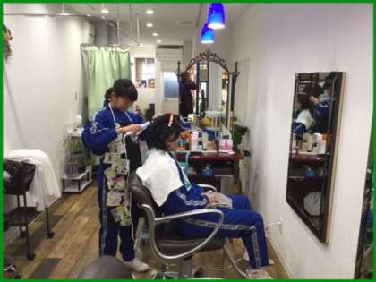 粉浜商店街に昨年開業された美容室の「タピール・ヘアー」に、2名の生徒がお世話になっています。昨日、教えられたことをノートにまとめ、早速、友だち同士で実践しました。