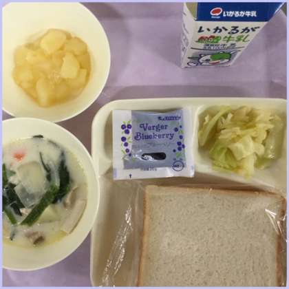 本日の献立は、ほうれんそうのクリームシチュー、キャベツのサラダ、洋ナシです。
