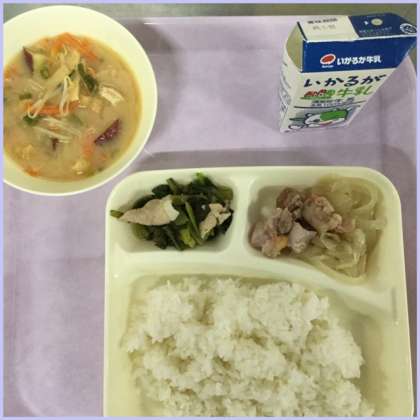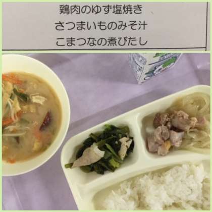 本日の献立は、鶏肉のゆず塩焼き、さつまいものみそ汁、こまつなの煮びたしです。