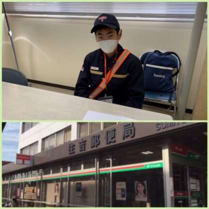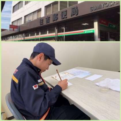 住吉郵便局では、制服を着せていただいて、2名の生徒がお世話になりました。