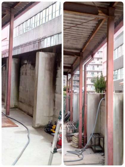 昨日から、学校南側と高速道路側のコンクリートブロックの上部一段を撤去する工事が行われています。