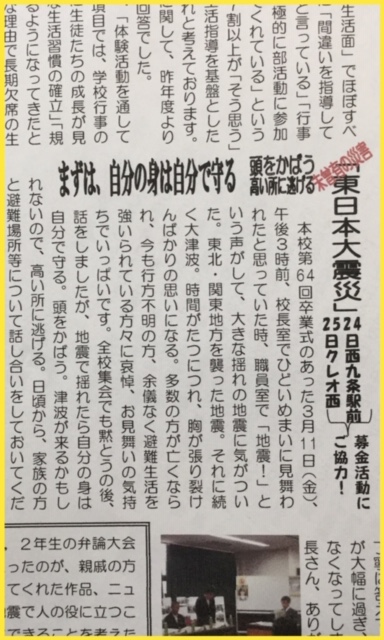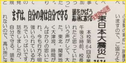 ※写真は、校長先生が、震災の直後に発行された「校長室だより」の関連記事です。