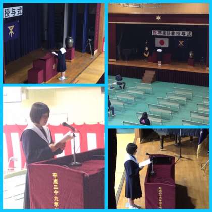 明日、13日の卒業式本番に向けて、会場づくり、教職員の打ち合わせ、代表生徒の動きの確認など午前中に行いました。