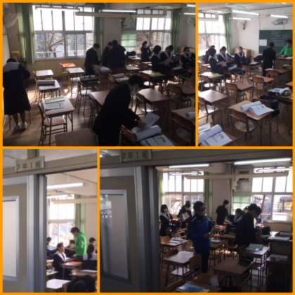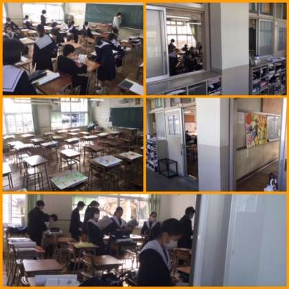 本日(17日)、久しぶりの登校。感染拡大予防のため、クラスごとに時間を変えての分散登校。登校後も、アルコール消毒液で手指の消毒をして、教室へ。教室は、一クラスを二教室に分かれて活動です。写真は、1年1組の様子で、教室は、1年1組の教室と真下にある3年1組の教室を使っています。分散登校のため隣の教室にはまだ登校していません。10時から1年2組、11時から1年3組、午後は1時から2年1組、午後2時から2年2組、午後3時から2年3組の登校です。