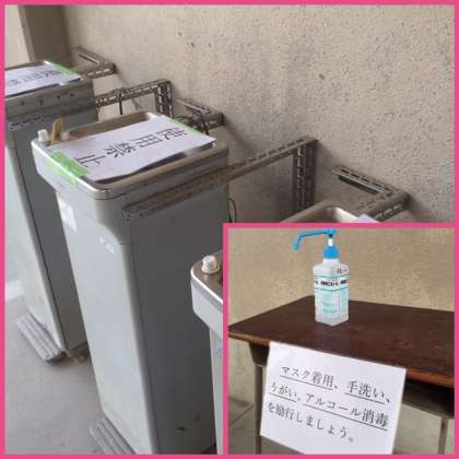 生徒、保護者の皆さまには、学校に入られたら、入り口で手指の消毒をしていただきます。また、咳エチケットのため、マスクの着用にご協力ください。発熱のある方、体調不良の方は入場できません。