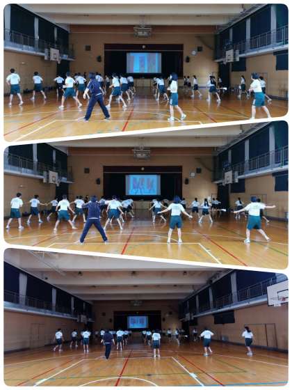 体育館からTRFの「EZ DO DANCE」の音楽が聞こえてきたので、覗いてみると体育の授業で2,3年生がダンスを踊っていました。