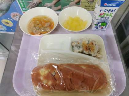 本日の給食は、マカロニグラタン、スープ、カットリンゴ、オサツパン、牛乳でした。