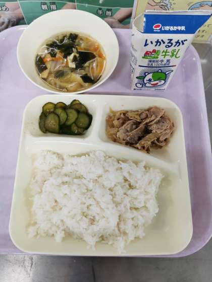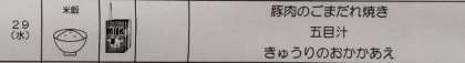 本日の給食は、豚肉のごまだれ焼き、五目汁、きゅうりのおかかあえ、米飯、牛乳でした。