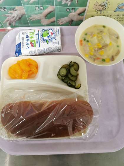 本日の給食は、コーンクリームシチュー、きゅうりのバジル風味サラダ、みかん(缶)、黒糖パン、牛乳でした。