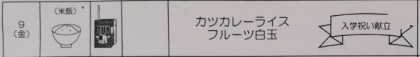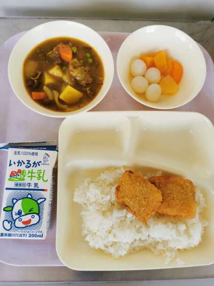 本日の学校給食は、カツカレーライス、フルーツ白玉、米飯、牛乳でした。
