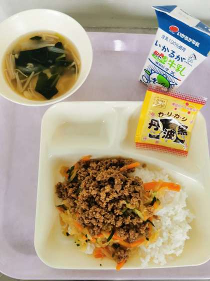 本日の学校給食は、ビビンバ、トック、いり黒豆、米飯、牛乳でした。