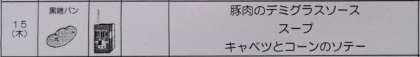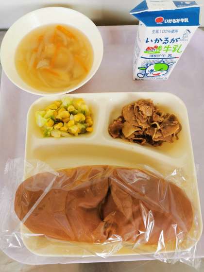 本日の学校給食は、豚肉のデミグラスソース、スープ、キャベツとコーンのソテー、黒糖パン、牛乳でした。