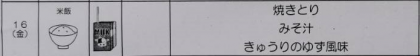 本日の学校給食は、焼きとり、みそ汁、きゅうりのゆず風味、米飯、牛乳でした。
