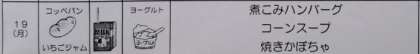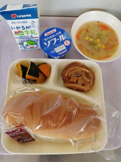 本日の学校給食は、煮こみハンバーグ、コーンスープ、焼きかぼちゃ、コッペパン、ヨーグルト、牛乳でした。