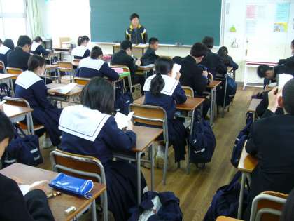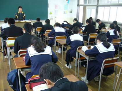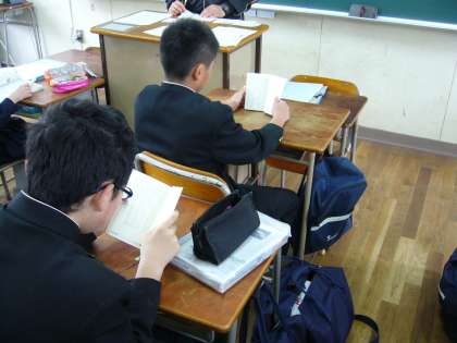 【写真は始業前、2年生「朝読書」の教室風景です】
