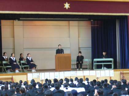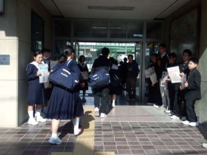 いよいよ、今日が立会演説会本番。昨日のリハーサルを終え、それぞれの立候補者が、より良い「一中」を築こうと立派な公約を述べてくれました。また、応援演説で舞台に立った生徒も、推薦の言葉に力を込めて語ってくれました。本日、選挙管理委員会が開かれ、明日、開票結果が放送や掲示で発表される予定です。 【写真中は、昨日朝の登校時です】