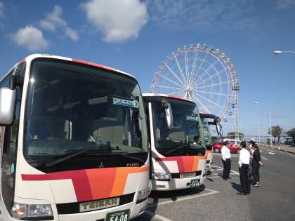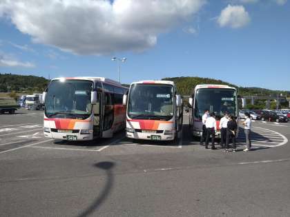淡路SAです。高速道路が渋滞で予定より遅れましたが、みんな元気です。これから車内レクが始まります。レク担当が頑張ってます。