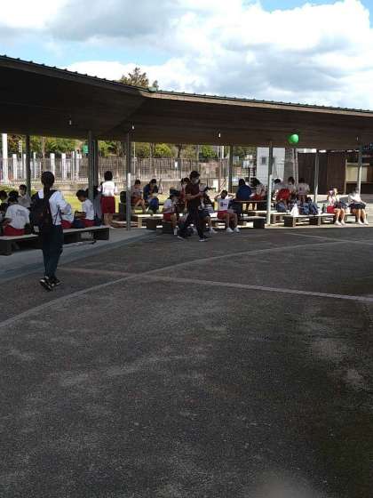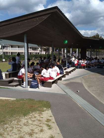 吉野川ハイウェイオアシスに到着しました。お昼ごはんです。早朝よりお弁当をご用意いただき、ありがとうございます。生徒たちは、穏やかないい顔で食べてます。