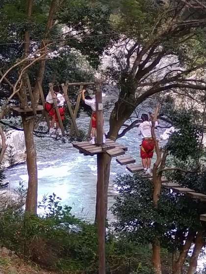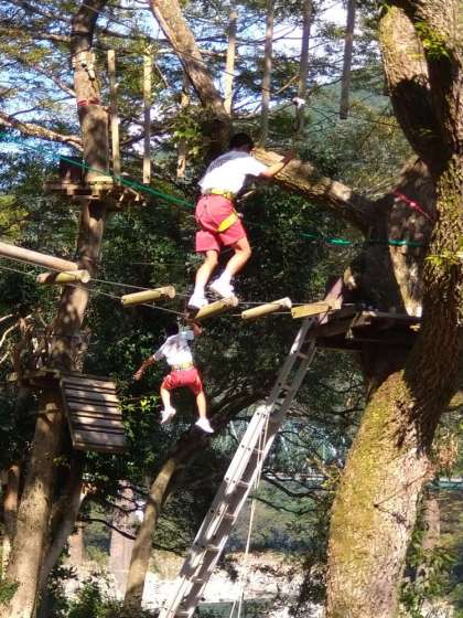 「え〜!こわいよ、助けて!」と言いつつ、一歩一歩、確実に進んで行くツリートレッキング、でも顔は笑顔です。