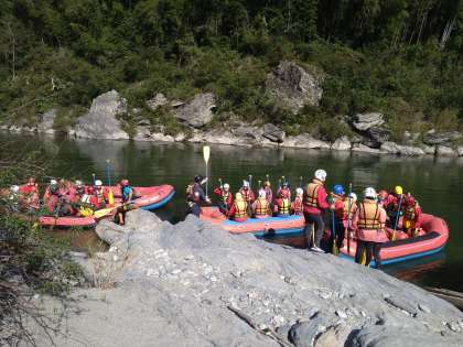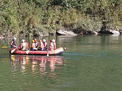 ラフティング、スタートしました。慣れないヘルメットとライフジャケットを着用して、パドル操作の練習からです。絶好のラフティング日和。一中生、本当に持ってます!